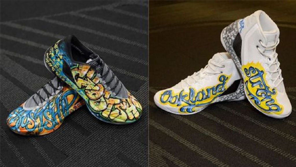 The designer shoes went to an anonymous bidder on eBay and had the words "Oakland Strong" written on them.