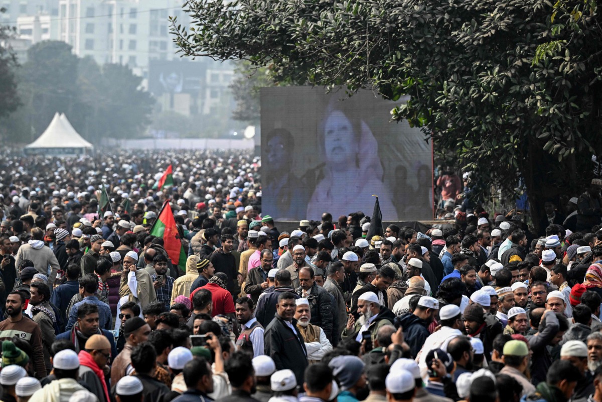 Mourners attend the funeral ceremony of Bangladesh's former prime minister Khaleda Zia in Dhaka on December 31, 2025 a day after her death. Photo by Munir UZ ZAMAN / AFP