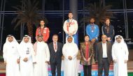 The podium winners at the Qatar Fencing Grand Prix pose for a picture with officials of Qatar Fencing Federation at Gate Mall yesterday....